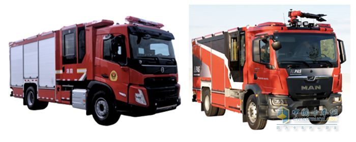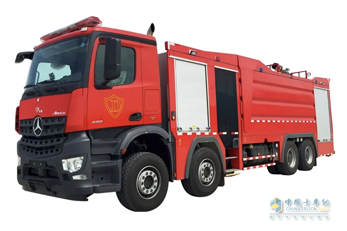 经过多次试验,该车灭火剂装载量大,高层供水高度可达300m,能切实解决扑救高层建筑火灾中消防供水的“软肋”问题。在此基础上,上海金盾持续丰富其高层供水消防车产品矩阵,陆续推出多款升级车型,以适应更加细分复杂的实战环境。其中PM120/B6G高层供水消防车采用Arocs 3346E6底盘,配置CB10/110-Qtwo型双级消防泵,常压流量可达100L/s,输出高压流量30L/s。此款车可携带12吨灭火剂,乘员配置为2+4人。其特点是底盘稳定性好,适合城市高层建筑及广泛应用于消防作业。PM180/B6G车型采用Arocs 4158E6底盘,配备CB10/110-Qtwo型双级消防泵,常压流量为110L/s,高压流量30L/s,载液量为18吨,适合更大规模的灭火任务,乘员配置为2+4人。该车型具备更强的灭火能力,能够应对高层建筑和工业区的复杂灭火需求,适合大型消防作业。SG180/B6W高层供水消防车同样使用Arocs 4163E6底盘,采用CB10/120-CMUC20型三级消防泵,常压流量达到120L/s,输出高压流量30L/s,具备更强的灭火能力,载液量为18吨,适合需要更高性能的场景,乘员配置为2+3+4人。此车具有出色的耐久性和稳定性,特别适合面对大规模火灾时,具有强力灭火和长时间连续作业的能力。AP120VL60车型则使用FM540 64R B底盘,配备CB10/110-Qtwo型双级消防泵,常压流量为110L/s,高压流量30L/s,适合较小规模的灭火任务,载液量12吨,并配备压缩空气泡沫系统,乘员配置为2+3+4人。